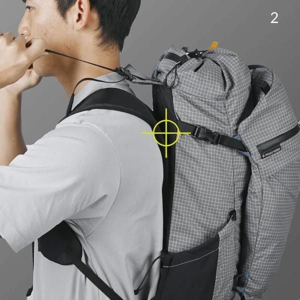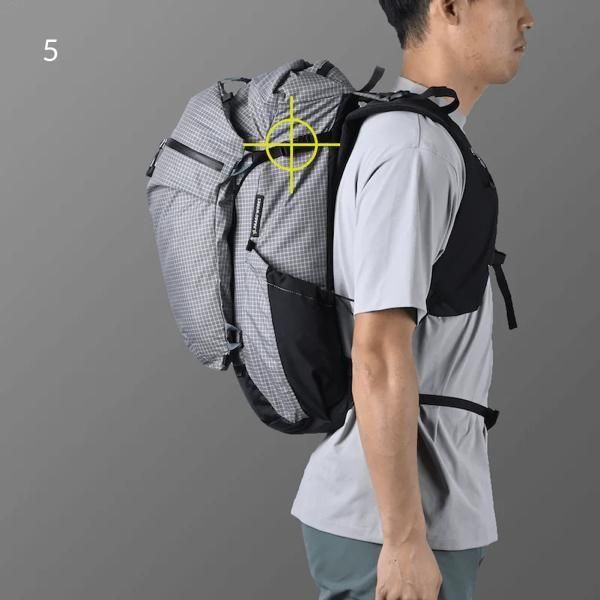 標準的なバックパックよりもショルダーハーネスの支点を低く設定。