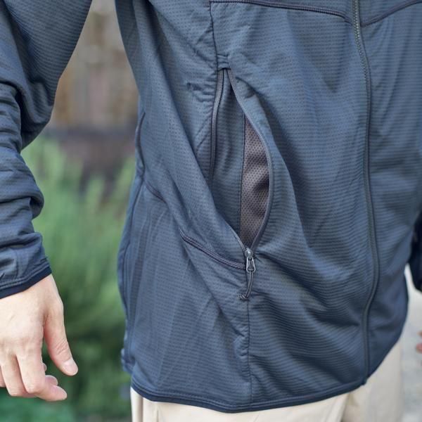 左右のジップメッシュハンドポケットはベンチレーションの役割も果たします。